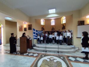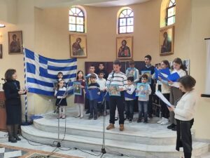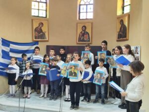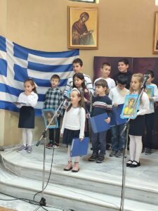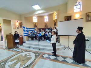 Στην συνέχεια τα παιδάκια του κατηχητικού του Μητροπολιτικού Ιερού Ναού Αγίων Κων/νου και Ελένης υπό την επίβλεψη της κατηχήτριας τους κας Μαρίας Οικονομίδου και της εκπαιδευτικού κας Αναστασίας Σατλάνη παρουσίασαν ένα υπέροχο θεατρικό με τους ήρωες του 21 και τραγούδια.