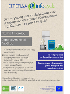 Σας προσκαλούμε στην Εσπερίδα «Infocycle – Όλη η γνώση για τη διαχείριση των Αποβλήτων Ηλεκτρικού και Ηλεκτρονικού Εξοπλισμού… σε μια Εσπερίδα», στην Καρδίτσα στις 11/06/2015 στο Ξενοδοχείο Domotel.