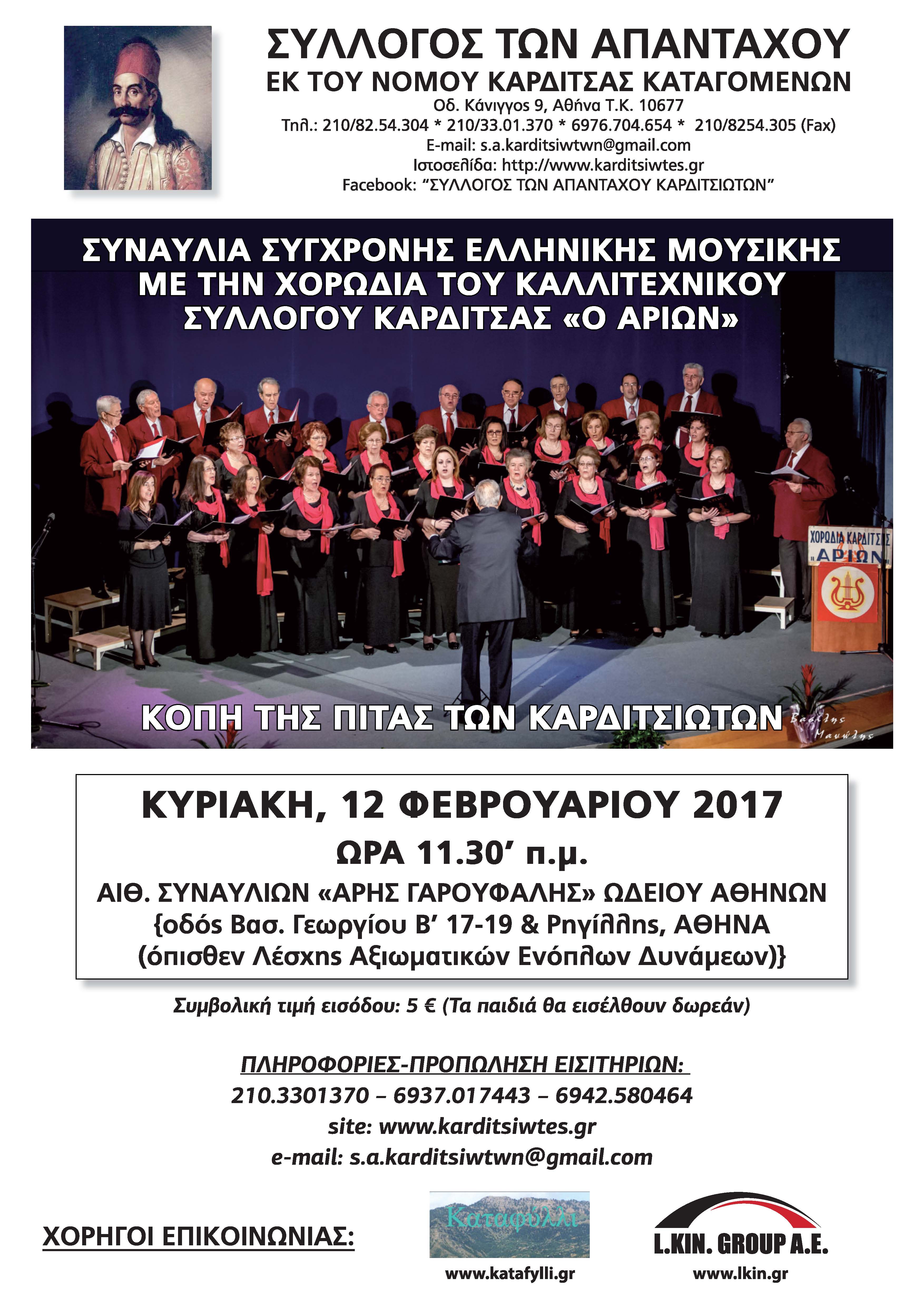 Ο Σύλλογος των Απανταχού Καρδιτσιωτών προσκαλεί όλους τους Καρδιτσιώτες και τους Θεσσαλούς την προσεχή Κυριακή, 12 Φεβρουαρίου 2017 και ώρα 11.30’ π.μ. ότε θα πραγματοποιήσει στην Αθήνα, στην αίθουσα συναυλιών «Άρης Γαρουφαλής» του Ωδείου Αθηνών {οδός Βασ. Γεωργίου 17-19 & Ρηγίλλης – όπισθεν Λέσχης Αξιωματικών Ενόπλων Δυνάμεων} μεγάλη συναυλία σύγχρονης μουσικής με την γνωστή 35μελή χορωδία του Καλλιτεχνικού Συλλόγου Καρδίτσας «Ο ΑΡΙΩΝ» υπό τον μαέστρο Χρήστο Σάλτη.