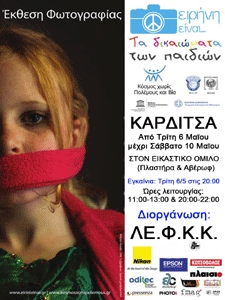 Η Λέσχη Φωτογραφίας & Κινηματογράφου Καρδίτσας (ΛΕ.Φ.Κ.Κ.) είναι στην ευχάριστη θέση, να φιλοξενεί και φέτος, την Έκθεση του Διεθνούς Διαγωνισμού Φωτογραφίας «Ειρήνη είναι» με θέμα «Τα δικαιώματα των παιδιών», για το χρονικό διάστημα από Τρίτη 6 έως Σάββατο 10 Μαΐου 2014, στην αίθουσα του Εικαστικού Ομίλου Καρδίτσας. Το διαγωνισμό διοργάνωσε για 5η χρονιά το Ελληνικό Γραφείο του Διεθνή Οργανισμού “Κόσμος χωρίς πολέμους και βία”, υποβλήθηκαν συνολικά 830 φωτογραφίες, από 317 φωτογράφους και 61 χώρες από όλο τον κόσμο. Στην Έκθεση παρουσιάζονται οι 73 διακριθείσες φωτογραφίες των 4 κατηγοριών του διαγωνισμού, 46 φωτογράφων από 21 χώρες. Ιδιαίτερο, είναι το ενδιαφέρον των φωτογραφιών της κατηγορίας «Νέοι έως 16 ετών».