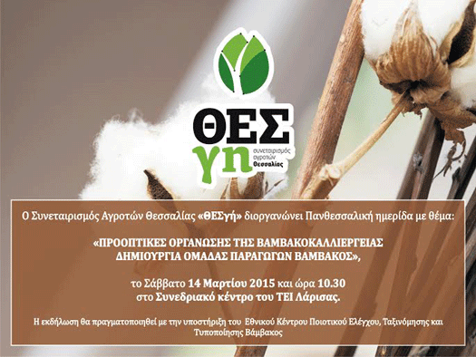 Ο Συνεταιρισμός Αγροτών Θεσσαλίας «ΘΕΣγή» διοργανώνει Πανθεσσαλική ημερίδα με θέμα: «ΠΡΟΟΠΤΙΚΕΣ ΟΡΓΑΝΩΣΗΣ ΤΗΣ ΒΑΜΒΑΚΟΚΑΛΛΙΕΡΓΕΙΑΣ – ΔΗΜΙΟΥΡΓΙΑ ΟΜΑΔΑΣ ΠΑΡΑΓΩΓΩΝ ΒΑΜΒΑΚΟΣ», το Σάββατο 14 Μαρτίου 2015 και ώρα 10.30 στο Συνεδριακό κέντρο του ΤΕΙ Λάρισας.