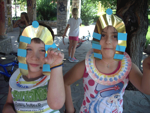 Στη συνέχεια, έφτιαξαν φανταχτερά κοσμήματα, τιάρες, κορόνες κι άλλα αξεσουάρ, στολισμένα με όμορφα χρώματα κι αναπαράστησαν στο χώρο τις βιβλιοθήκες τις συνήθειες των αρχαίων Αιγυπτίων.