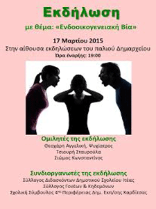 Ο Σύλλογος Διδασκόντων του σχολείου μας, αναγνωρίζοντας το πρόβλημα ως πιθανή γενεσιουργό αιτία μιας «προβληματικής συμπεριφοράς» μαθητών στην καθημερινή τους συναναστροφή με τους συμμαθητές τους αλλά και στην εκπαιδευτική τους πορεία, οργανώνει σε συνεργασία με την κα. Ντιβέρη Παναγιώτα, σχολική Σύμβουλο 4ης Π.Δ.Ε. Καρδίτσας και το Σύλλογο Γονέων και Κηδεμόνων του σχολείου μας, εκδήλωση στις 17 του Μάρτη και ώρα 19:00 στην αίθουσα Εκδηλώσεων του παλιού Δημαρχείου Ιτέας , στα πλαίσια της ενημέρωσης για θέματα που απασχολούν την εκπαιδευτική κοινότητα, αλλά και τους γονείς, με θέμα την «Ενδοοικογενειακή Βία» με εισηγητές : την κα. Θεοχάρη Αγγελική MD, ψυχίατρο Ενηλίκων , υποψήφια PhD , με θέμα «Ενδοοικογενειακή Βία και ζευγάρι», την κα. Τσιουρή Σταυρούλα, δικηγόρο MSc Νομικής, με θέμα «Ενδοοικογενειακή Βία και νομικό πλαίσιο», και τον κ. Σιώμο Κωνσταντίνο MD, MSc, PhD, ψυχίατρο Παιδιών και Εφήβων, με θέμα «Ενδοοικογενειακή Βία και παιδιά».