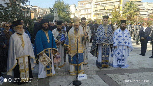 Στη συνέχεια, προέστη της επισήμου Δοξολογίας, η οποία εψάλη μετά το πέρας της Θείας Λειτουργίας, επί τη εθνική επετείω του ΟΧΙ και της επιμνημοσύνου δεήσεως, που έλαβε χώρα στο Ηρώο των πεσόντων στον προαύλιο χώρο του ως άνω Ιερού Μητροπολιτικού Ναού.