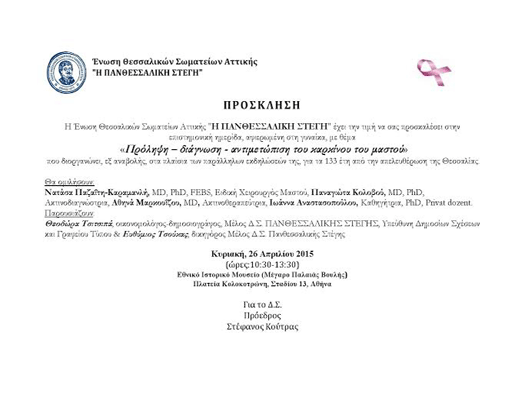 Ημερίδα με θέμα «Πρόληψη – διάγνωση – αντιμετώπιση του καρκίνου του μαστού», διοργανώνει, εξ αναβολής, η Ένωση Θεσσαλικών Σωματείων Αττικής «Η Πανθεσσαλική Στέγη», στα πλαίσια των παράλληλων εκδηλώσεών της, για τα 133 έτη από την απελευθέρωση της Θεσσαλίας. Η ημερίδα θα πραγματοποιηθεί την Κυριακή, 26 Απριλίου 2015 (ώρες:10:30-13:30), στο Εθνικό Ιστορικό Μουσείο (Μέγαρο Παλαιάς Βουλής), Πλατεία Κολοκοτρώνη, Σταδίου 13, Αθήνα. Στην ημερίδα θα ομιλήσει και η σύζυγος του πρώην πρωθυπουργού Νατάσα Παζαϊτη-Καραμανλή