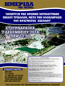 Ο Σύλλογος Επαγγελματιών Ορεινού Οδικού Άξονα Τρικάλων – Άρτας, o Δήμος Πύλης, το Α.Τ.Ε.Ι. Θεσσαλίας, το Τ.Ε.Ε. Τμήμα Κεντ. & Δυτικής Θεσσαλίας, & το ΓΕΩΤ.Ε.Ε. (Παράρτημα Κεντ. Ελλάδας), συνδιοργανώνουν Ημερίδα με θέμα: «Ανάπτυξη της ορεινής Νοτιοδυτικής Πίνδου Τρικάλων μετά την ολοκλήρωση του φράγματος Αχελώου». Κυριακή 7 Δεκεμβρίου 2014 (στην αίθουσα του πρώην Δημαρχείου Πινδέων) Στα Στουρναραίϊκα Τρικάλων.