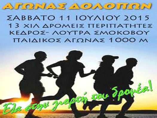 Μέσα στο πνεύμα του κλασικού αθλητισμού και της ευγενούς άμιλλας διοργανώνεται το Σάββατο 11 Ιουλίου ο 9ος Αγώνας Δρόμου Δολόπων με σημείο εκκίνηση τον Κέδρο και τερματισμό στα Λουτρά Σμοκόβου.