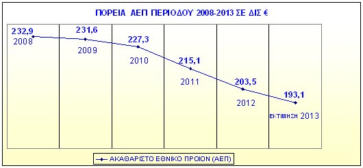 Ωστόσο αυτή η πολιτική των οριζόντιων περικοπών και της αυστηρής δημοσιονομικής πειθαρχίας, νεοφιλελεύθερης έμπνευσης, που εφαρμόζεται με την προτροπή της τρόικα, για άλλη μια φορά, είναι ατελέσφορη, χωρίς προοπτική για την ελληνική κοινωνία. Οδηγεί στην υποαπασχόληση, την ανεργία και τη μείωση εισοδημάτων με συνέπεια την ακόμη μεγαλύτερη ύφεση, η οποία φυσικά καταλήγει σε σημαντική υστέρηση εσόδων του κράτους. Πρόκειται για ένα καθοδικό «σπιράλ» που καταλήγει στη φτωχοποίηση της μεσαίας τάξης και την εξαθλίωση των κατώτερων στρωμάτων της κοινωνίας. Ήδη η επίσημη ανεργία «τρέχει»  με 24,4%, και στους νέους ξεπέρασε το 54%. Εκτιμάται επίσης, ότι ο πλούτος που παράγεται στη χώρα (ΑΕΠ) από 232,9 δις ευρώ που ήταν το 2008, θα κινείται τα επόμενα τρία χρόνια, κάτω από τα 190 δις ευρώ. Η καταστροφή που έχει υποστεί η ελληνική οικονομία είναι ανεπανόρθωτη. Στο διάγραμμα παρουσιάζεται η ζημιά που έχει υποστεί η συνολική «πίτα» (ΑΕΠ) της χώρας από το 2008- όταν ξέσπασε η παγκόσμια κρίση- μέχρι το επόμενο έτος (2013).