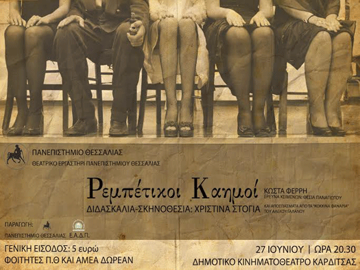 Το Θεατρικό Εργαστήρι του Πανεπιστημίου Θεσσαλίας συνεχίζει τις παραστάσεις με το έργο του Κώστα Φέρρη «Ρεμπέτικοι καημοί». Η έρευνα των κειμένων είναι της Θέσιας Παναγιώτου (με αποσπάσματα από τα «Κόκκινα φανάρια» του Αλέκου Γαλανού) και η σκηνοθεσία – διδασκαλία της Χριστίνας Στόγια. Την παραγωγή υπογράφουν το Πανεπιστήμιο Θεσσαλίας και η Εταιρεία Αξιοποίησης & Διαχείρισης της Περιουσίας του Π.Θ.