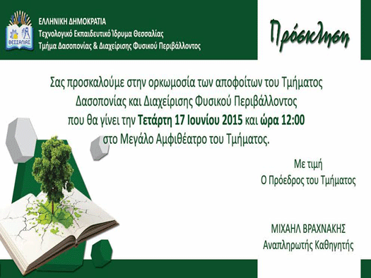 Ειδήσεις Ορκωμοσία αποφοίτων Δασοπονίας Καρδίτσας karditsanews 10 Ιουνίου, 2015 39 Views Την Τετάρτη 17 Ιουνίου στις 12 το μεσημέρι στο Αμφιθέατρο του ΤΕΙ Δασοπονίας Καρδίτσας θα πραγματοποιηθεί η τελετή ορκωμοσίας των νέων αποφοίτων της Σχολής.