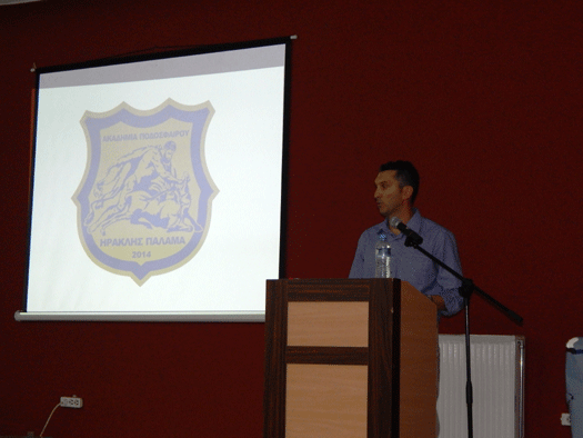 Την παρουσίαση προλόγισε ο τεχνικός διευθυντής της ακαδημίας Κωνσταντίνος Τρουβάς και αναφέρθηκε στον λόγο που επέλεξαν για την Ακαδημία,  το όνομα  Ηρακλής,  αναφέροντας χαρακτηριστικά : «Καταρχήν να σας πούμε ότι επιλέξαμε τον Ηρακλή γιατί είναι ένας ήρωας για όλα τα παιδιά και αντιπροσωπεύει το θάρρος, τη δύναμη και την αρετή.  Ο μύθος που σώθηκε από τον Ξενοφώντα, μας διηγείται το περιστατικό εκείνο, όταν ο Ηρακλής καθισμένος σε κάποιο σταυροδρόμι, είδε να περνούν από μπροστά του δύο πανέμορφες κοπέλες. Η μια του έδειξε έναν εύκολο δρόμο, φαρδύ και ίσιο, που αν τον ακολουθούσε, θα χαιρόταν τη ζωή, αλλά θα έκανε ένα σωρό κακές πράξεις που θα τον καταδίκαζαν στην κρίση των ανθρώπων. Αυτή ήταν η Κακία. Η άλλη κόρη, η Αρετή, του έδειξε ένα δύσκολο δρόμο, γεμάτο κοφτερές πέτρες και αγκάθια, στενό και δύσβατο, που θα τον βάδιζε δύσκολα, αλλά θα κέρδιζε στο τέλος του την αναγνώριση από τους συνανθρώπους του. Έτσι ο Ηρακλής ακολούθησε την Αρετή, προτιμώντας να υποφέρει για να διαβεί το δύσβατο δρόμο της, αλλά να γνωρίσει τη δόξα και την τιμή με τις καλές του πράξεις και την αρετή του»  και συνέχισε εξηγώντας πως εμπνεύστηκαν το νέο έμβλημα.