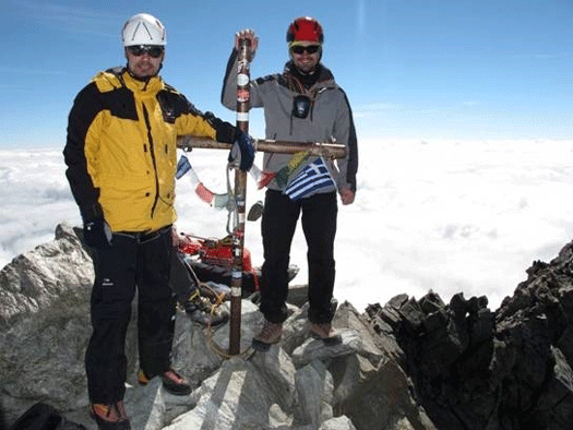 Η ράχη συνεχίζει ακόμα στενότερη με χιόνι και κορνίζες (σε υψόμετρο 4100 μέτρα) ενώ πιο ψηλά η κλίση της αυξάνεται φτάνοντας τις 50 μοίρες. Το μεγάλο υψόμετρο έδρασε στα περισσότερα μέλη της αποστολής με πονοκεφάλους και κόπωση όσο πλησίαζαν προς την κορυφή. Ο καιρός ήταν ιδανικός με ήλιο και χωρίς καθόλου αέρα, ενώ την ίδια ημέρα έφτασαν στην κορυφή άλλοι 18 ορειβάτες, κάτι ασυνήθιστο για το Weisshorn. Σκαρφαλώνοντας και τη βραχώδη πυραμίδα της κορυφής, μετά από 8 ώρες ανάβασης, οι τέσσερις ορειβάτες έφτασαν στην κορυφή του Weisshorn στις 09:00 το πρωί όπου είναι τοποθετημένος ένας μεγάλος μεταλλικός σταυρός. Η θέα προς τις αμέτρητες κορυφές των Άλπεων ήταν απερίγραπτη, ενώ οι διπλανές κορυφές Zinalrothorn, Dent Blance και Matterhorn προέβαλαν σαν πύργοι και ξεχώριζαν από τις άλλες. Κοιτώντας ανατολικά προέβαλε η ομάδα των κορυφών του Mischabel μαζί με το ζευγάρι των κορυφών Dom-Taschorn που είναι από τις ψηλότερες της Ελβετίας. Η επιστροφή έγινε από την ίδια διαδρομή με παράλληλη κίνηση και κάνοντας συνολικά 4 ραπέλ, τα τρία στους τρείς πύργους πάνω στην ανατολική ράχη και ένα στη βάση της προ-κορυφής. Μετά από μία προσπάθεια δεκαπέντε ωρών τα τέσσερα μέλη επέστρεψαν, στις 16:30, πανευτυχή στην κατασκήνωση και γιόρτασαν την επιτυχία με ένα γεύμα στο καταφύγιο.