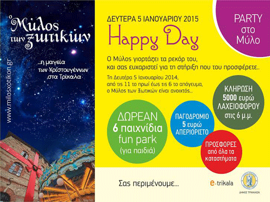 Τη Δευτέρα 5 Ιανουαρίου 2015, από τις 11 το πρωί έως τις 6 το απόγευμα, ο Μύλος των Ξωτικών θα είναι ανοιχτός με ελεύθερη είσοδο στα 6 παιχνίδια του Fun Park, με προσφορές από όλα τα καταστήματα και απεριόριστη πρόσβαση στο Παγοδρόμιο με 5 ευρώ.