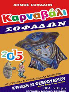 Ο Δήμος Σοφάδων, μέσα από μια σειρά εκδηλώσεων, που κορυφώνονται με την μεγάλη παρέλαση την Κυριακή της Αποκριάς, σας προσκαλεί να διασκεδάσετε με τα Σοφαδίτικα καρναβαλικά δρώμενα και τα παραδοσιακά έθιμα που ιχνηλατούνται βαθιά στον χρόνο.