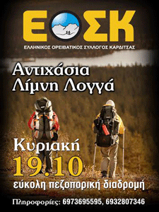 Συνεχίζοντας τις δραστηριότητες του, ο Ελληνικός Ορειβατικός Σύλλογος Καρδίτσας (ΕΟΣΚ) σε συνεργασία με τον ΣΟΧ Τρικάλων, την Κυριακή 19 Οκτώβρη οργανώνει πεζοπορία στα Αντιχάσια των Τρικάλων, και συγκεκριμένα στην λίμνη Λογγά.