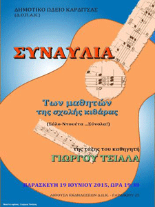 Το Δημοτικό Ωδείο, το οποίο ανήκει στο Δημοτικό Οργανισμό Πολιτισμού και Αθλητισμού Kαρδίτσας (ΔΟΠΑΚ), οργανώνει την Παρασκευή 19 Ιουνίου 2015 και ώρα 7.30 μ.μ. την ετήσια μαθητική συναυλία της σχολής κιθάρας, της τάξης του καθηγητή Γιώργου Τσιάλα.