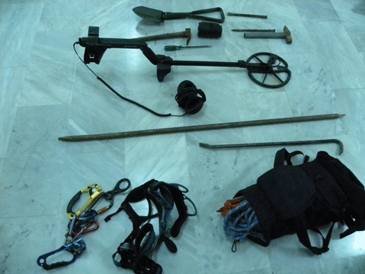 Ειδικότερα, οι συλληφθέντες κατελήφθησαν από τους αστυνομικούς να επιβαίνουν σε Ι.Χ. Επιβατικό αυτοκίνητο, στο εσωτερικό του οποίου βρέθηκαν και κατασχέθηκαν εργαλεία ανασκαφής χρησιμοποιημένα πρόσφατα, καθώς και ανιχνευτής μετάλλων, προοριζόμενος για αρχαιολογικές ανασκαφές.