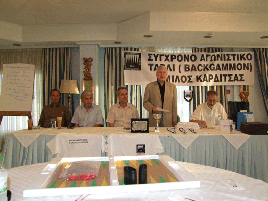 Στην τελετή των απονομών των επάθλων στους νικητές και διακριθέντες της χρονιάς παραβρέθηκε ο Δήμαρχος Καρδίτσας κ. Φ. Αλεξάκος ο οποίος έκανε και τις απονομές. Σε σύντομη ομιλία του εξήρε τις προσπάθειες του Ομίλου και των μελών-αθλητών του για την ανάπτυξη-διάδοση των πνευματικών αθλημάτων backgammon και bridge στην περιοχή μας και υποσχέθηκε κάθε δυνατή βοήθεια και συμπαράσταση από τον Δήμο.