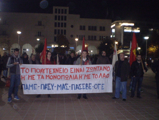 «Πέρασαν κιόλας 41 χρόνια από τον ηρωικό ξεσηκωμό του λαού και της νεολαίας το Νοέμβρη του 1973 και το Πολυτεχνείο εξακολουθεί να εμπνέει τους αγώνες του λαού μας ενάντια στον ιμπεριαλισμό και τη σημερινή βάρβαρη πραγματικότητα. Συνεχίζει να φλογίζει τις καρδιές όσων δε συμβιβάζονται, όσων δε βολεύονται με την αδικία και την αγριότητα που φέρνουν στο λαό και τη νεολαία οι πολιτικές που υπηρετούν τα μονοπώλια και την Ευρωπαϊκή Ένωση.