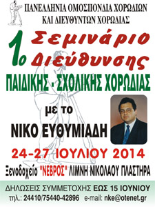 Ένα εξαιρετικά ενδιαφέρον σεμινάριο Διεύθυνσης Σχολικής – Παιδικής Χορωδίας θα πραγματοποιηθεί από Πέμπτη απόγευμα 24 Ιουλίου έως Κυριακή μεσημέρι 27 Ιουλίου στην πανέμορφη Λίμνη Νικολάου Πλαστήρα και στο ξενοδοχείο NEVROS (Νεοχώρι), σε ένα από τα καλύτερα ξενοδοχεία της περιοχής, που διοργανώνει η Πανελλήνια Ομοσπονδία Χορωδιών και Διευθυντών Χορωδίας σε συνεργασία με το Διεθνές Φεστιβάλ Καρδίτσας και το Ωδείο Καρδίτσας – Κων/νος Ευθυμιάδης.