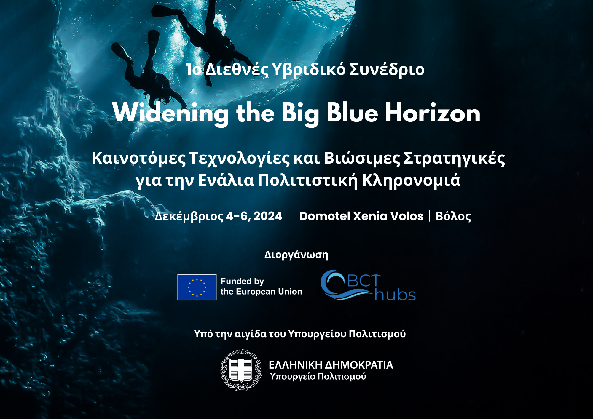 Το ευρωπαϊκό έργο Horizon BCThubs, διοργανώνει το 1ο Διεθνές Συνέδριο Widening the Big Blue Horizon, υπό την αιγίδα του Υπουργείου Πολιτισμού. Το συνέδριο θα πραγματοποιηθεί στο Βόλο (στο Domotel Xenia Volos), από την Τετάρτη 4 έως την Παρασκευή 6 Δεκεμβρίου 2024, και θα διεξαχθεί υβριδικά, προσφέροντας την επιλογή στους συμμετέχοντες να το παρακολουθήσουν είτε δια ζώσης είτε διαδικτυακά.