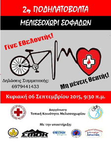 Με σκοπό την ευαισθητοποίηση του πληθυσμού στην εθελοντική αιμοδοσία, την Κυριακή 06 Σεπτεμβρίου 2015 και ώρα 9:30 θα διεξαχθεί η 2η Ποδηλατοβόλτα Μελισσοχωρίου.