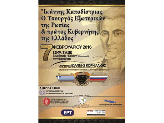 O Αντιπεριφερειάρχης κ.Τσιάκος Βασίλειος, εκ μέρους της Περιφερειακής Ενότητας Καρδίτσας σε συνδιοργάνωση με τον Δήμο Καρδίτσας, την Ι.Μ Θεσσαλιώτιδος και Φαναριοφερσάλων και τον Σύλλογο Κρητών Ν.Καρδίτσας, διοργανώνουν την Κυριακή 7 Φεβρουαρίου 2016 και ώρα 19:00 στην αίθουσα διαλέξεων του Ξενοδοχείου “Κιέριον” (Αίθουσα Αφροδίτη), την εκδήλωση με θέμα: “Ιωάννης Καποδίστριας. Ο Υπουργός Εξωτερικών της Ρωσίας & …
