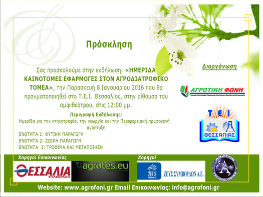 Το Τ.Ε.Ι. Θεσσαλίας και η εφημερίδα Αγροτική Φωνή διοργανώνουν ημερίδα με θέμα Καινοτόμες Εφαρμογές στον Αγροδιατροφικό Τομέα. Η ημερίδα θα διεξαχθεί την Παρασκευή 8 Ιανουαρίου 2016 στις 12:00 στο Αμφιθέατρο Διοίκησης και Διαχείρισης Έργων του Τ.Ε.Ι. Θεσσαλίας. Θα παρουσιαστούν καινοτομίες, νέες τεχνολογίες και πρακτικές λύσεις που έχουν αναπτυχθεί από το Τ.Ε.Ι Θεσσαλίας αλλά και οι …
