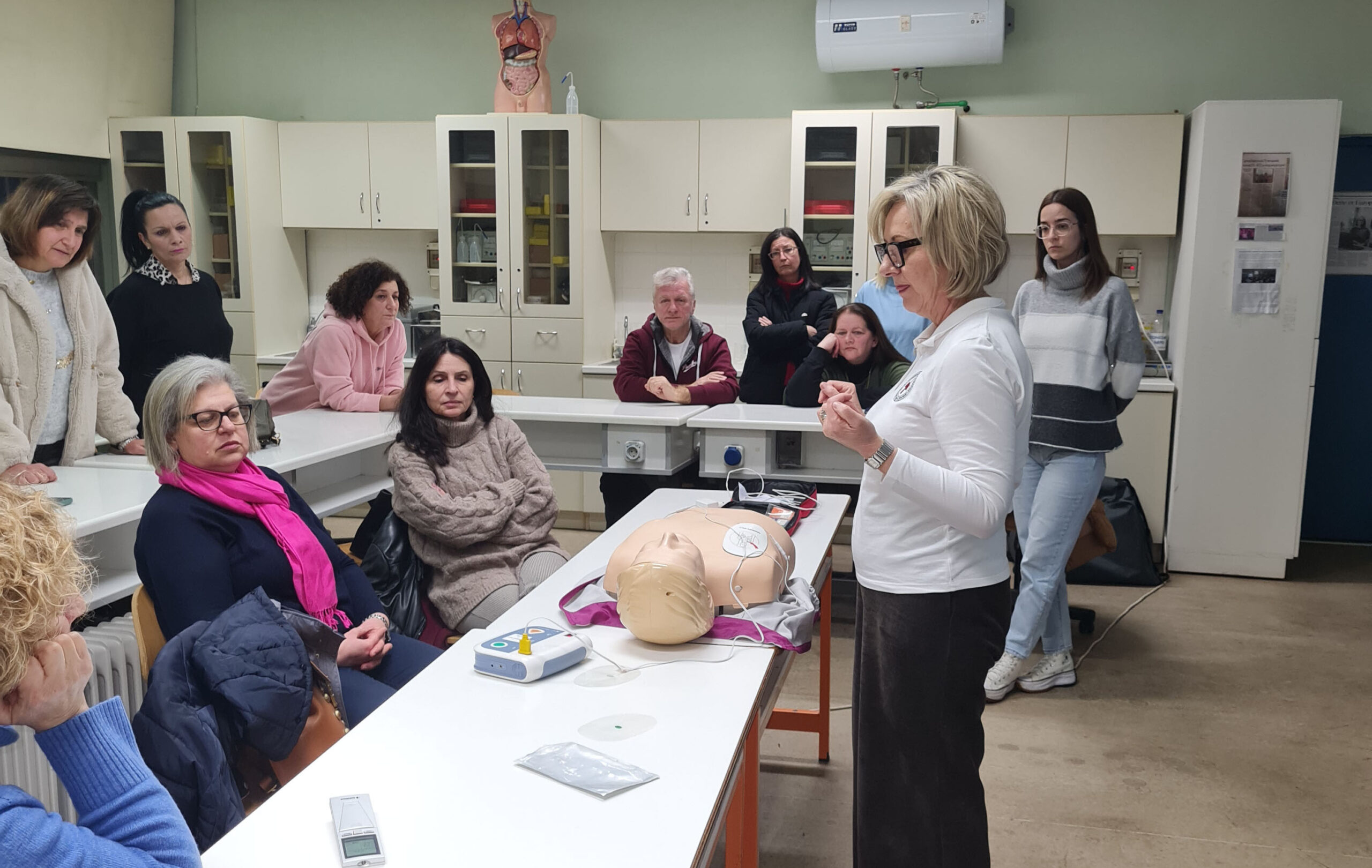 Την Τετάρτη 28 Ιανουαρίου πραγματοποιήθηκε εκπαίδευση στις Πρώτες Βοήθειες των εκπαιδευτικών του 4ου Γενικού Λυκείου Καρδίτσας από την εθελόντρια του Περιφερειακού Τμήματος του Ελληνικού Ερυθρού Σταυρού Καρδίτσας κ. Βασιά Κλεοπάτρα. Στόχος της δράσης ήταν η παροχή βασικών γνώσεων και δεξιοτήτων στους εκπαιδευτικούς, ώστε να παρεμβαίνουν άμεσα και αποτελεσματικά σε επείγοντα περιστατικά υγείας που ενδεχομένως προκύψουν τόσο στον χώρο του σχολείου όσο και έξω από αυτόν. Συγκεκριμένα, έγινε επίδειξη της τεχνικής της Καρδιοπνευμονικής Αναζωογόνησης και της χρήσης απινιδωτή, καθώς και των ενδεδειγμένων ενεργειών για τη διαχείριση λιποθυμικών επεισοδίων, περιστατικών πνιγμονής και ρινορραγίας. Ακολούθησε εφαρμογή των συγκεκριμένων τεχνικών από τους εκπαιδευτικούς και επίλυση αποριών.