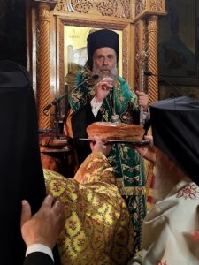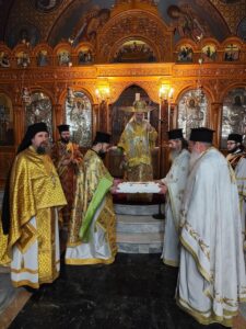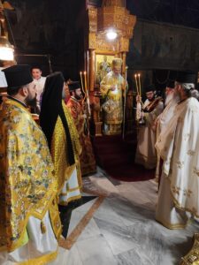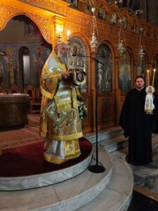«Δόξα στον Τριαδικό Θεό που μας αξιώνει απόψε να βρισκόμαστε όλοι μαζί, να τελέσουμε τη Θεία Λειτουργία, με τους πατέρες και με όλον τον λαό. Και βέβαια, με αφορμή την ανακομιδή και την κατάθεση του Ιερού Λειψάνου του Μεγαλομάρτυρος Αγίου Γεωργίου, οι ευχαριστίες μας είναι μεγάλες, γιατί μας δίδεται και τυπικά η ευλογία και η χάρη του Μεγαλομάρτυρος Αγίου Γεωργίου του Τροπαιοφόρου ανάμεσά μας.