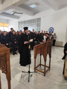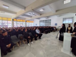 Απευθυνόμενος ιδιαιτέρως στους δοκίμους αστυφύλακες, ο Σεβασμιώτατος αναφέρθηκε στη σημασία της υπευθυνότητας, της υπακοής και της μεταξύ τους ενότητας μέσα στο περιβάλλον της Σχολής, τονίζοντας ότι η κοινή ζωή απαιτεί σεβασμό, αλληλοκατανόηση και αλληλοπροστασία. Υπογράμμισε ακόμη ότι στο μέλλον, όταν θα υπηρετήσουν στην κοινωνία, η παρουσία τους και μόνο θα πρέπει να εμπνέει στους πολίτες αίσθημα ειρήνης και ασφάλειας.