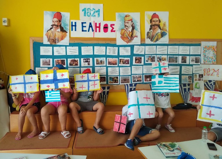 Τα παιδιά άκουσαν για την Άλωση της Πόλης, το κρυφό σχολειό, της ίδρυση της Φιλικής Εταιρείας.. Διαβάσαμε το ενδιαφέρον βιβλίο «Γαλανόλευκη σημαία» της Ματουλας Τολκα από τις εκδόσεις «Λιβάνη» και το «Επανάσταση 1821» της Σοφίας Ζαραμπούκα, από τις εκδόσεις Πατάκη, χορέψαμε το χορό του Ζαλόγγου και κατασκευάσαμε τις δικές μας σημαίες – λάβαρα του 1821..,με διάφορα χρώματα και παραστάσεις και την φράση “Ελευθερία ή θάνατος”.