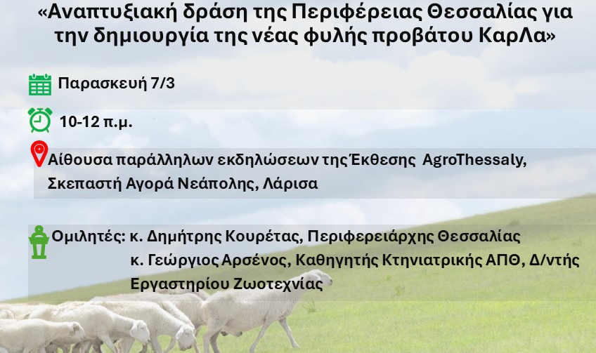 Το θέμα της εκδήλωσης θα είναι “Αναπτυξιακή δράση της Περιφέρειας Θεσσαλίας για την δημιουργία της νέας φυλής προβάτου ΚάρΛαP .