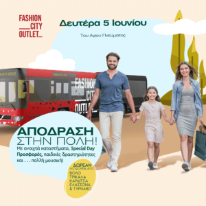 Τη Δευτέρα του Αγίου Πνεύματος, στις 5 Ιουνίου, το Fashion City Outlet περιμένει μικρούς και μεγάλους για μια μονοήμερη «Απόδραση στην Πόλη», με ανοιχτά καταστήματα, μοναδικές προσφορές ΜΟΝΟ για την ημέρα του Αγίου Πνεύματος, παιδικές δραστηριότητες, μουσική με Live Radio και δωρεάν μεταφορά από πόλεις της Θεσσαλίας . Μια ημέρα γιορτή που δεν πρέπει να χάσεις!