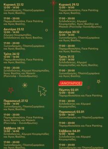 Αναλυτικά το πρόγραμμα των παιδικών δραστηριοτήτων από το Σάββατο 14 Δεκεμβρίου έως το Σάββατο 4 Ιανουαρίου έχει ως εξής.