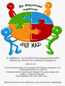 Θα πραγματοποιήσουμε μια δράση σαν 2ο Δημοτικό σχολείο Καρδίτσας το Σάββατο 12 Δεκεμβρίου 2015. Όνομα Δράσης: ”ΟΛΟΙ ΜΑΖΙ”. Αντικείμενο: Εκστρατεία συλλογής τροφίμων με σκοπό την ενίσχυση των συσσιτίων της πόλης μας. Σημείο συγκέντρωσης: Εάν δεν βρέχει, στην τράπεζα Alpha, στην Πλατεία. Σε περίπτωση που ο καιρός είναι άσχημος, θα συγκεντρωθούμε στο αίθριο ”δημοτική αγορά” Ώρα …