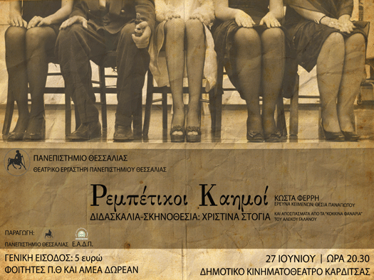 Το Θεατρικό Εργαστήρι του Πανεπιστημίου Θεσσαλίας συνεχίζει τις παραστάσεις με το έργο του Κώστα Φέρρη «Ρεμπέτικοι καημοί». Η έρευνα των κειμένων είναι της Θέσιας Παναγιώτου (με αποσπάσματα από τα «Κόκκινα φανάρια» του Αλέκου Γαλανού) και η σκηνοθεσία – διδασκαλία της Χριστίνας Στόγια. Την παραγωγή υπογράφουν το Πανεπιστήμιο Θεσσαλίας και η Εταιρεία Αξιοποίησης & Διαχείρισης της …