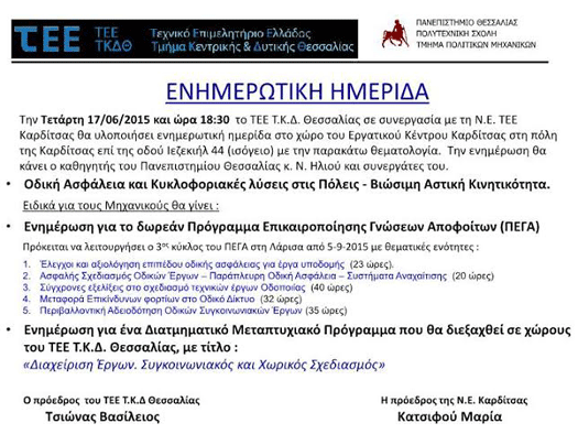 Την Τετάρτη 17/06/2015 και ώρα 18:30 το ΤΕΕ Τ.Κ.Δ. Θεσσαλίας σε συνεργασία με τη Ν.Ε. ΤΕΕ Καρδίτσας θα υλοποιήσει ενημερωτική ημερίδα στο χώρο του Εργατικού Κέντρου Καρδίτσας στη πόλη της Καρδίτσας επί της οδού Ιεζεκιήλ 44 (ισόγειο). Την ενημέρωση θα κάνει ο καθηγητής του Πανεπιστημίου Θεσσαλίας κ. Ν. Ηλιού και συνεργάτες του.