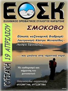 Συνεχίζοντας τις δραστηριότητες του αλλά και την εθελοντική του δράση ο Ελληνικός Ορειβατικός Σύλλογος Καρδίτσας (ΕΟΣΚ), την Κυριακή 19 Απρίλη θα βρίσκεται στην περιοχή της λίμνης Σμοκόβου. Θα γίνει πεζοπορία με ταυτόχρονη σηματοδότηση και καθαρισμός του μονοπατιού που ξεκινάει από τα λουτρά Σμοκόβου και ανεβαίνει στην κορυφή Προφήτης Ηλίας (984 μέτρα), όπου σώζονται ερείπια αρχαιοελληνικού κάστρου. Η διαδρομή έχει ήδη καταγραφεί και …