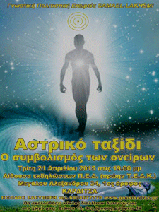 Την Τρίτη 21 Απριλίου 2015 στις 19.00 μ.μ., στην Αίθουσα εκδηλώσεων ΠΕΔ (πρώην ΤΕΔΚ) Μεγάλου Αλεξάνδρου 34, 1ος όροφος, θα δοθεί από τη Γνωστική πολιτιστική Εταιρεία Samael-Lakhsmi, εναρκτήρια διάλεξη με θέμα: ‘’ΑΣΤΡΙΚΟ ΤΑΞΙΔΙ’’ Ο συμβολισμός των ονείρων ‘ Ο Αστρικός κόσμος είναι ένας πραγματικός κόσμος, γι’ αυτούς που έχουν την ικανότητα να τον επισκέπτονται συνειδητά. …
