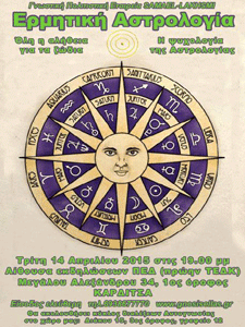 Την Τρίτη 14 Απριλίου 2015 στις 19.00 μ.μ., στην Αίθουσα εκδηλώσεων ΠΕΔ (πρώην ΤΕΔΚ) Μεγάλου Αλεξάνδρου 34, 1ος όροφος, θα δοθεί από τη Γνωστική πολιτιστική Εταιρεία Samael-Lakhsmi, εναρκτήρια διάλεξη με θέμα: «ΕΡΜΗΤΙΚΗ ΑΣΤΡΟΛΟΓΙΑ (Όλη η αλήθεια για τα ζώδια – Η ψυχολογία της Αστρολογίας)» Θα αναπτυχθούν θέματα που αφορούν τις αστρικές επιρροές, όπως οι επιρροές …