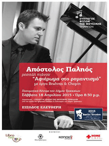 Ο ΣΥΛΛΟΓΟΣ ΦΙΛΩΝ ΤΗΣ ΜΟΥΣΙΚΗΣ ΤΡΙΚΑΛΩΝ διοργανώνει το Σάββατο 18 Απριλίου 2015 και ώρα 8.30 μ.μ. στο Πνευματικό Κέντρο του Δήμου Τρικκαίων , ρεσιτάλ πιάνου με τον εξαίρετο πιανίστα Απόστολο Παληό << Αφιέρωμα στο Ρομαντισμό>> , σε έργα των Brahms και Chopin. Ο Απόστολος Παληός, γεννημένος στην Καρδίτσα το 1979, είναι απόφοιτος και αριστούχος διδάκτορας …