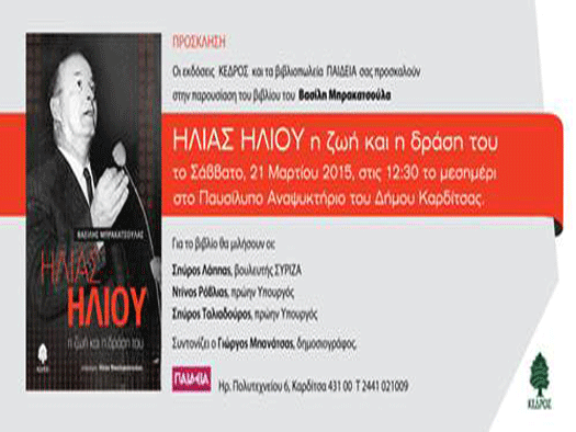 Οι εκδόσεις ΚΕΔΡΟΣ και τα βιβλιοπωλεία ΠΑΙΔΕΙΑ σας προσκαλούν στην παρουσίαση του βιβλίου του Βασίλη Μπρακατσούλα «ΗΛΙΑΣ ΗΛΙΟΥ η ζωή και η δράση του» τo Σάββατο, 21 Μαρτίου 2015, στις 12:30 το μεσημέρι στο Παυσίλυπο Αναψυκτήριο του Δήμου Καρδίτσας. Θα μιλήσουν οι: Σπύρος Λάππας, βουλευτής ΣΥΡΙΖΑ, Ντίνος Ρόβλιας, πρώην Υπουργός, Σπύρος Ταλιαδούρος, πρώην Υπουργός. Συντονίζει ο Γιώργος Μπανάτσας, δημοσιογράφος. Πληροφορίες: …