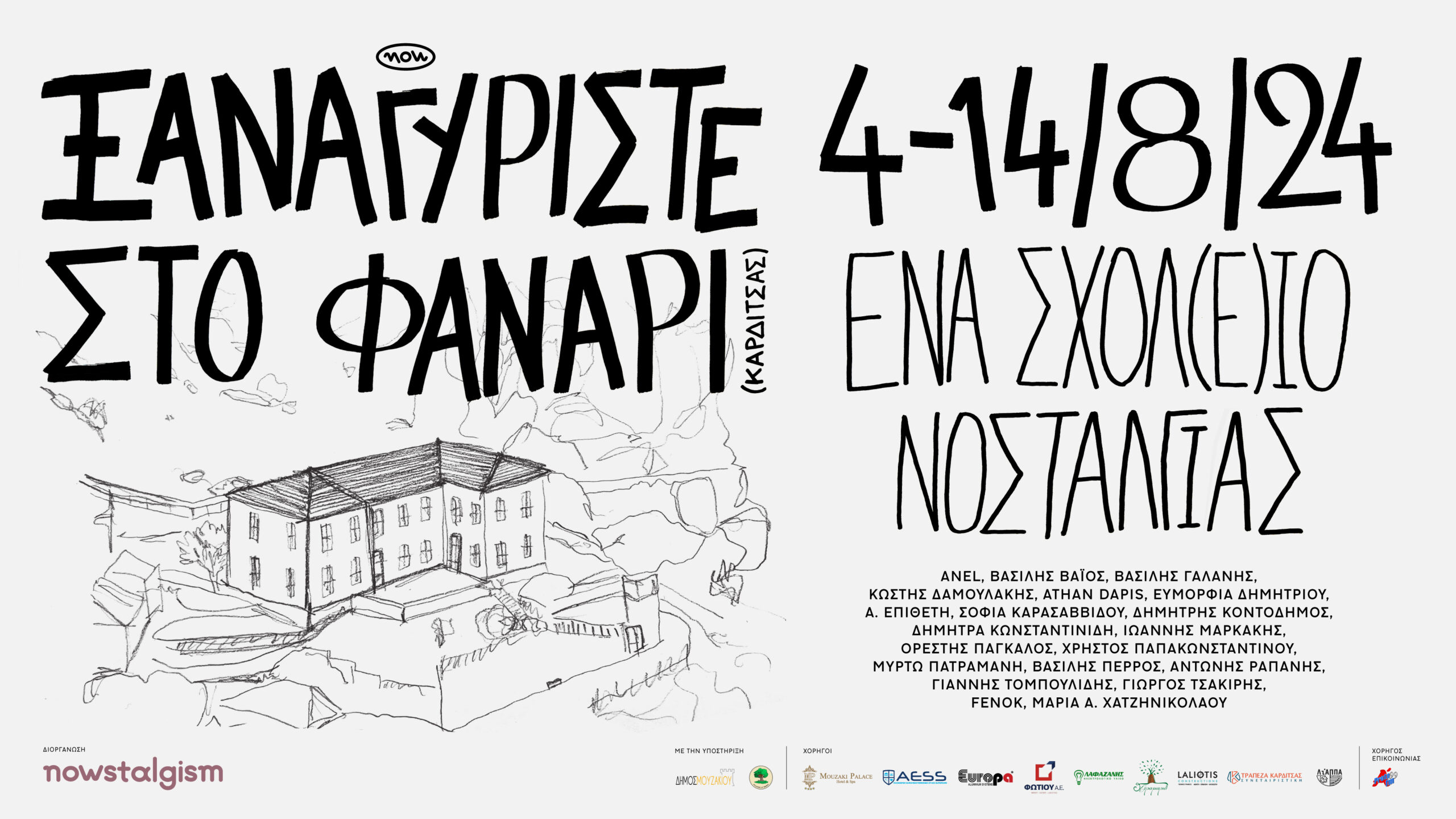 Η ομάδα Nowstalgism, επιστρέφει και φέτος στο Φανάρι Καρδίτσας, ενεργοποιώντας αυτή τη φορά, το παλιό Δημοτικό Σχολείο, ένα κτίριο σύμβολο και σημείο αναφοράς του χωριού. Αποτελεί ένα χαρακτηριστικό εντυπωσιακό πέτρινο κτίριο του Μεσοπολέμου, που δεσπόζει στο χωριό στο τέλος της αγοράς, σημαντικό και χαρακτηριστικό τοπόσημο, τόσο του χωριού, όσο και της ευρύτερης περιοχής. Μια κιβωτός μνήμης των αλλοτινών …