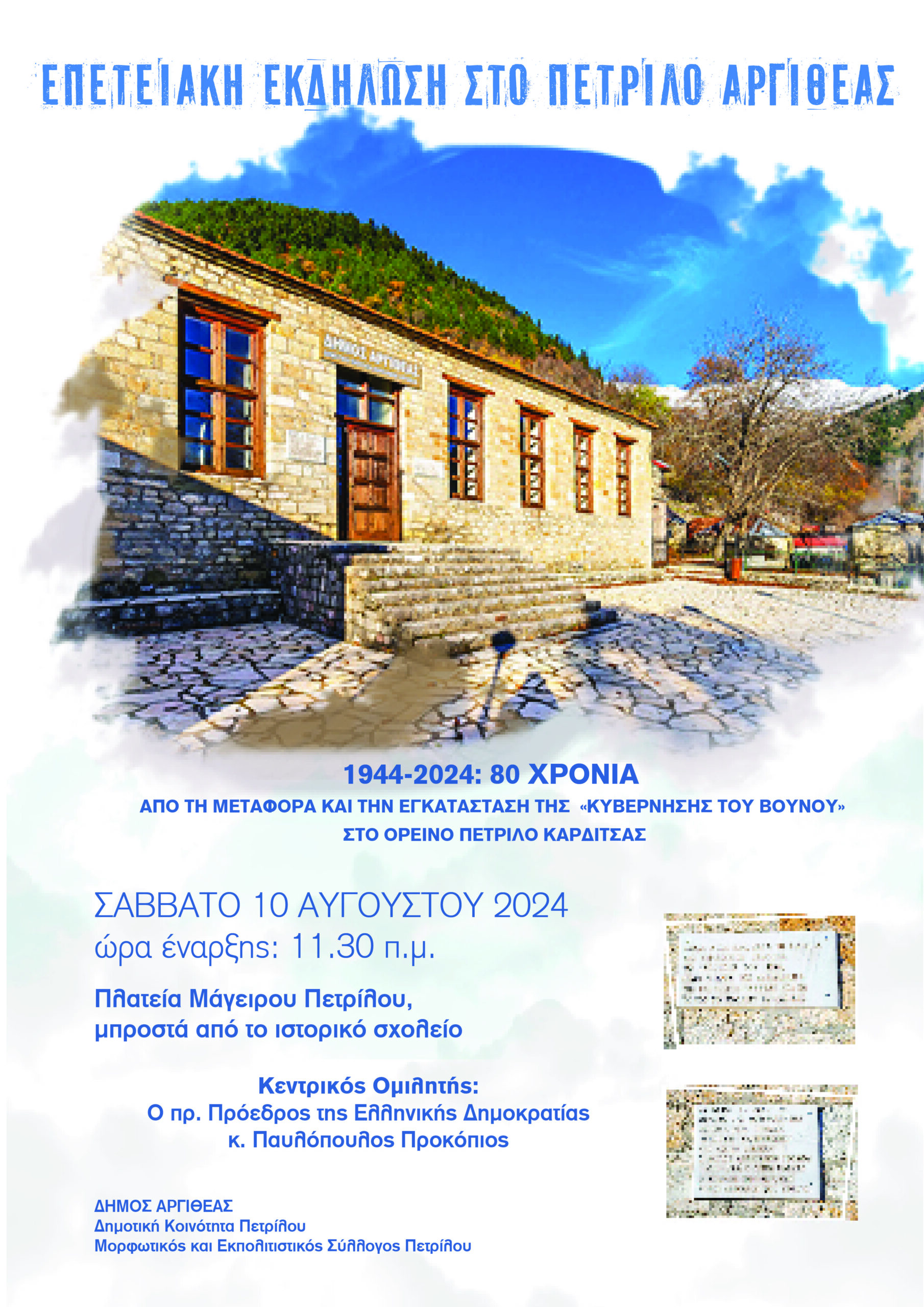 Σας γνωρίζουμε ότι ο Δήμος Αργιθέας της Π.Ε. Καρδίτσας διοργανώνει το Σάββατο 10 Αυγούστου 2024, (ώρα έναρξης 11.30 π.μ.) στο Πετρίλο (ιστορική έδρα του Δήμου μας), ξεχωριστή εκδήλωση για την Π.Ε.Ε.Α. (Πολιτική Επιτροπή Εθνικής Απελευθέρωσης). Η συγκεκριμένη (Μάγειρος) και μπροστά στο ιστορικό Δημοτικό Σχολείο, στις αίθουσες του οποίου συνεδρίαζε η Π.Ε.Ε.Α. για μήνες (Μάιος – Σεπτέμβριος 1944) και, με …
