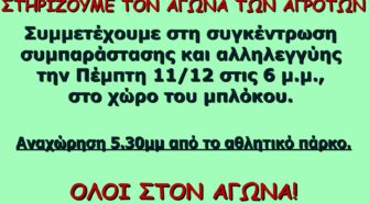 Χαιρετίζουμε τους χιλιάδες αγρότες και κτηνοτρόφους του νομού Καρδίτσας που βγήκαν, για μια φορά ακόμα, στους δρόμους του αγώνα, διεκδικώντας αγωνιστικά την ικανοποίηση αιτημάτων που αφορούν στην ίδια την επιβίωσή τους. Το μπλόκο της Ε65 στήθηκε παρά τις λυσσαλέες προσπάθειες της κυβέρνησης να κλείσει το δρόμο στα τρακτέρ, με την χρησιμοποίηση ισχυρών αστυνομικών δυνάμεων. Με …