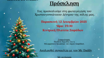Άναμμα Χριστουγεννιάτικου Δέντρου – Σας περιμένουμε όλους! Παρασκευή 12 Δεκεμβρίου – 19:30 Κεντρική Πλατεία Σοφάδων