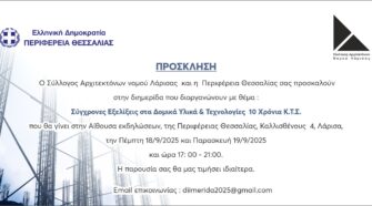Ο Σύλλογος Αρχιτεκτόνων Λάρισας και η Περιφέρεια Θεσσαλίας διοργανώνουν στη Λάρισα εκδήλωση με θέμα : “Σύγχρονες Εξελίξεις στα Δομικά Υλικά -Νέες Τεχνολογίες – Νέος Κ.Τ.Σ.” Η εκδήλωση θα πραγματοποιηθεί στις 18 και 19 Σεπτεμβρίου 2025, από τις 17:00 έως τις 21:00, στην Αίθουσα Εκδηλώσεων της Περιφέρειας Θεσσαλίας (Καλλισθένους 4, Λάρισα). Το πρωί της Παρασκευής 19 …