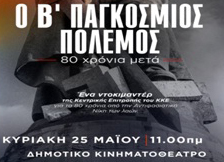 Η ΤΕ Καρδίτσας του ΚΚΕ την Κυριακή 25 Μάη στις 11 πμ στην αίθουσα του κινηματοθέατρου θα προβάλλει το ντοκιμαντέρ «Ο Β΄ΠΑΓΚΟΣΜΙΟΣ ΠΟΛΕΜΟΣ 80 ΧΡΟΝΙΑ ΜΕΤΑ», ένα ντοκιμαντέρ της Κεντρική Επιτροπής του κόμματος για τα 80 χρόνια από την αντιφασιστική νίκη των λαών.