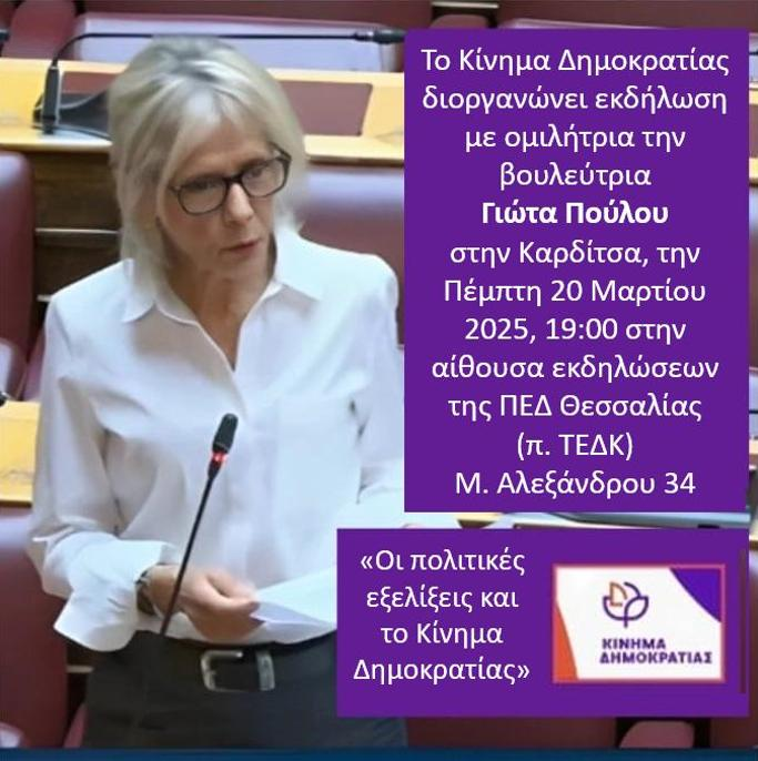 Η Ομάδα Πρωτοβουλίας Καρδίτσας του Κινήματος Δημοκρατίας διοργανώνει ανοιχτή εκδήλωση με θέμα: Οι πολιτικές εξελίξεις και το Κίνημα Δημοκρατίας